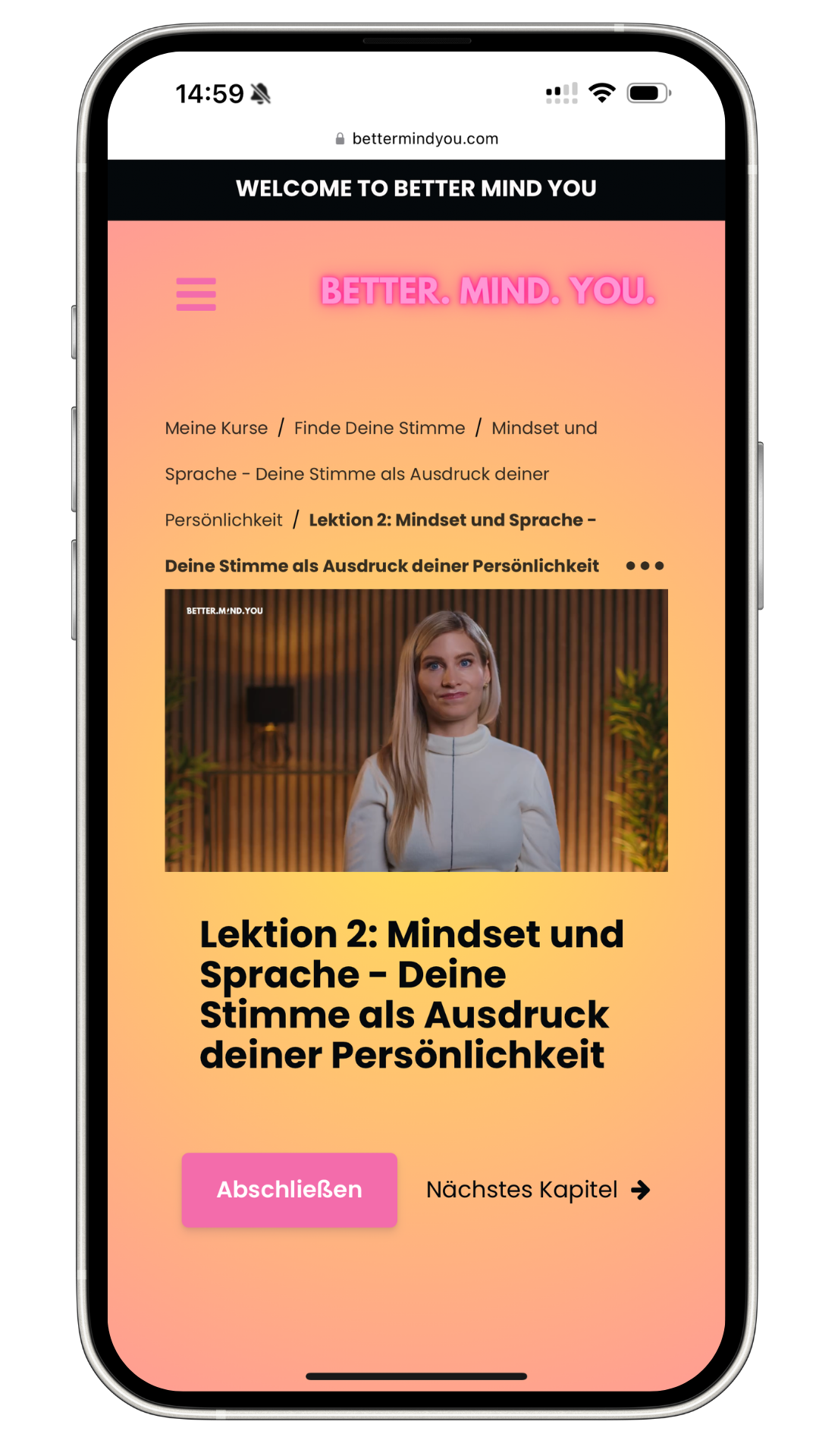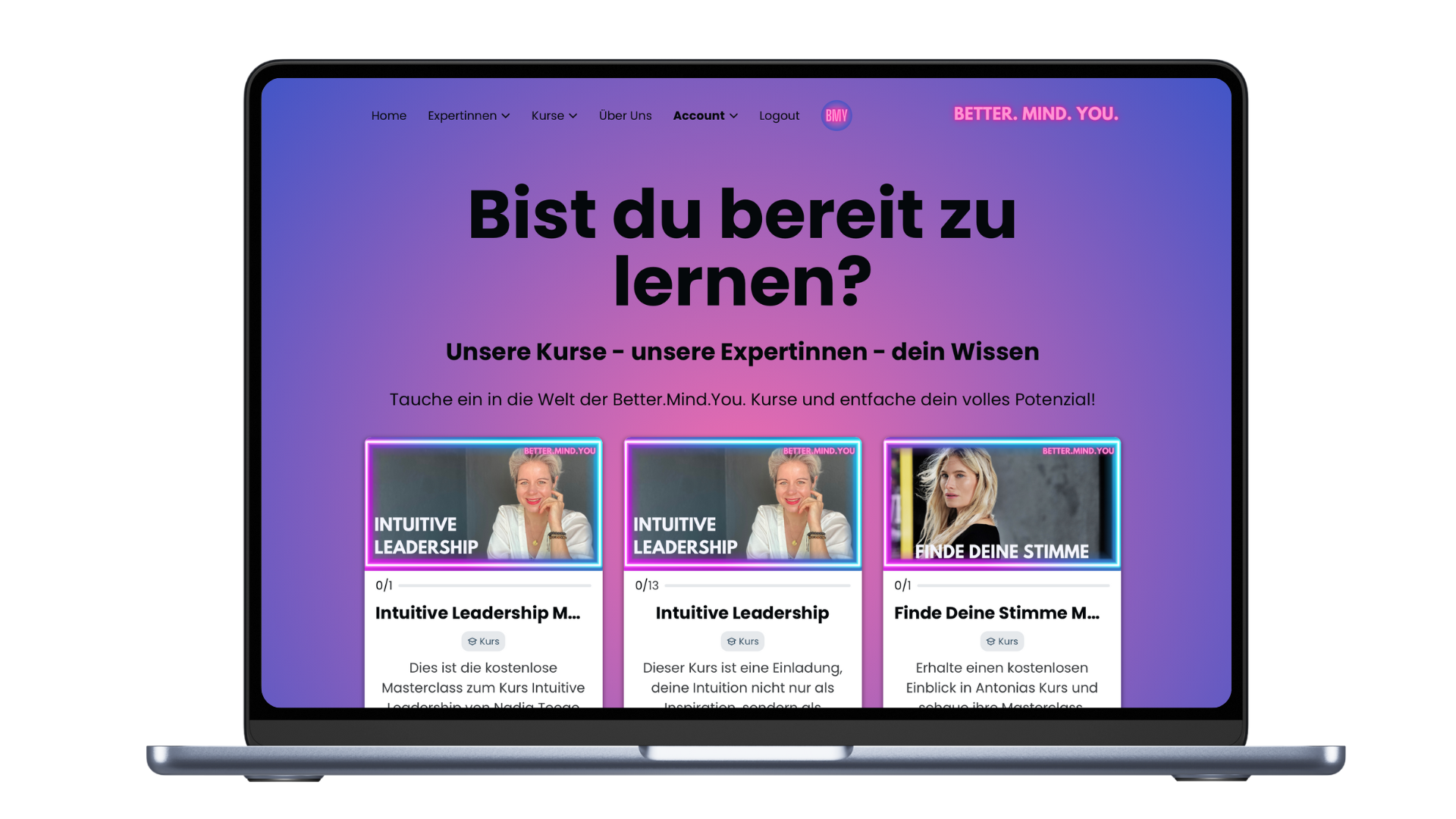 Bist du bereit dein bestes Selbst zu werden? Registriere dich unverbindlich bei BETTER.MIND.YOU. und erhalte kostenlosen Zugang zu unseren Masterclasses von renomierten Expertinnen der Persönlichkeitsentwicklung.